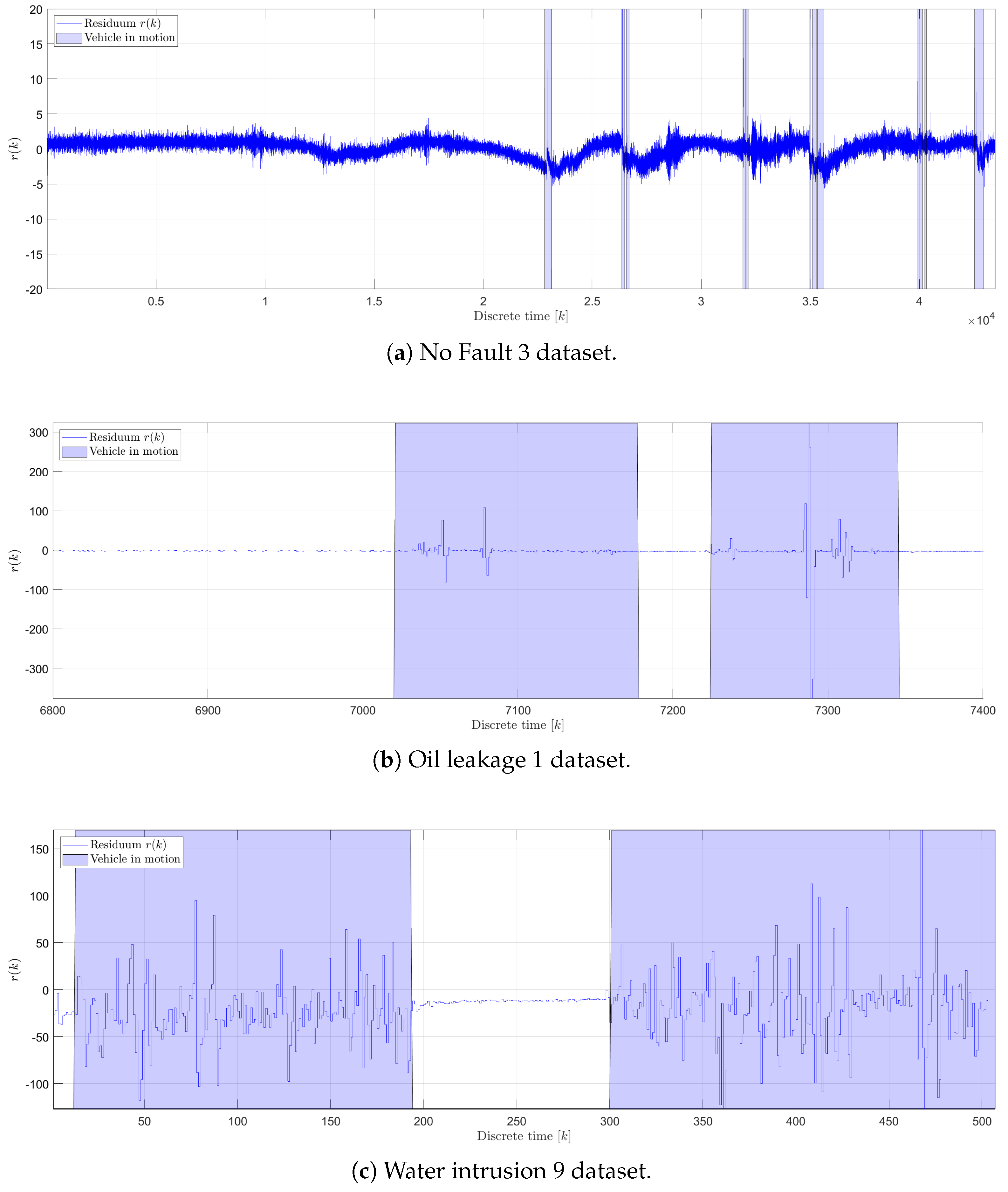The efficacy of the proposed fault detection method is notably influenced by the magnitude of the fault, illustrating a direct correlation between fault magnitude and detection performance. Additionally, the absence of mechanisms to facilitate forced liquid flow within the system means that the efficacy of the fault detection is tied to the vehicle’s movement. This dynamic is due to the placement of the sensor at the base of the container, mounted on small ribs, which could potentially limit the system’s sensitivity under certain conditions. Specifically, in cases of water intrusion, the fault magnitude must be significant enough for the water to reach the sensor under static conditions. If the volume of intruding water is too low, it may not make contact with the sensor unless the vehicle is in motion, causing the water droplets from the oil–water emulsion to circulate and eventually reach the detection threshold. This scenario highlights a critical area for potential enhancements in sensor placement or the introduction of active circulation mechanisms to improve fault detection sensitivity under a wider range of operational conditions.