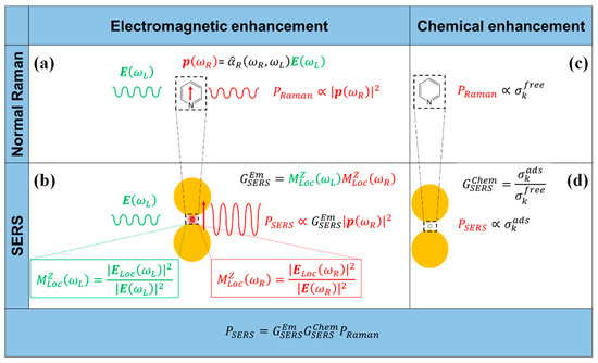 Electromagnetic enhancement. (a) Normal Raman. A laser radiation, with electric field E () oscillating at (angular) frequency impinges on a molecule, characterized by a Raman polarizability tensor (, ). The laser induces a dipole oscillating at the Raman frequency (vertical red arrow, p ()); the Raman power radiated by this dipole is proportional to the square modulus of the dipole itself. (b) SERS electromagnetic enhancement. When the molecule is placed near a plasmonic substrate, the electric field experienced by the molecule is (), normally much stronger than the input laser E (); this local field enhancement is quantified by (). Moreover, the presence of the plasmonic substrate also enhances the efficiency with which the dipole emits Raman radiation; this re-radiation enhancement is quantified by (). The total electromagnetic enhancement factor, within the approximation, is defined as: ()(). Chemical enhancement. (c) Normal Raman. The vibrational modes of a molecule in free space are characterized by the cross-section(s) ; (d) SERS chemical enhancement. The interaction with the plasmonic substrate modifies the structure of the molecule and consequently also the cross-section(s) of its modes (). The chemical enhancement is quantified as . Reprinted (adapted) with permission from Roberto et al. [12]. Copyright (2019), MDPI, Basel, Switzerland.
