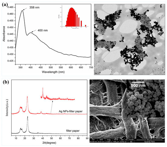 (a) Label-free NIR-SERS discrimination and detection of foodborne bacteria by in situ synthesis of Ag colloids: UV–visible spectrum and TEM image of Ag NPs prepared within bacteria mixture (external mode). Reprinted (adapted) with permission from Chen et al. [28]. Copyright (2015), BioMed Central. (b) Ag NP-filter paper-based SERS sensor coupled with multivariate analysis for rapid identification of bacteria: SEM image of the Ag NPs-filter paper substrate. Inset is the higher magnification image. Reprinted (adapted) with permission from Wang et al. [63]. Copyright (2023), Royal Society of Chemistry.