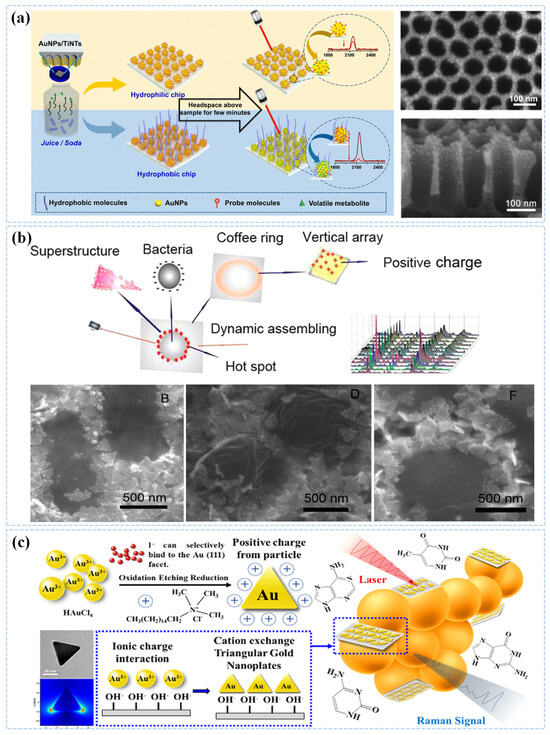(a) Schematic of hydrophobic interaction assisted SERS sensing of E. coli metabolites and SEM images of AuNPs/TiNTs: top view and side view. Reprinted (adapted) with permission from Li et al. [70]. Copyright (2023), Royal Society of Chemistry. (b) Schematic illustration of the one-step assembling and detection of bacteria via plasmonic bifacial TAuNP/AuNSs superstructures on a Au@Ag nanorod columnar array; SEM image of L. monocytogenes, S. xylosus and E. faecium bacteria adhered to SH-PEG-NH2 functionalized bifacial TAuNP-AuNSs superstructures on a nanorod columnar array. Reprinted (adapted) with permission from Li et al. [35]. Copyright (2016), American Chemical Society. (c) Schematic illustration of the one-step assembling and detection of bacteria via plasmonic bifacial TAuNP/AuNSs superstructures on a Au@Ag nanorod columnar array. Reprinted (adapted) with permission from Chiu et al. [36]. Copyright (2022) Royal Society of Chemistry.