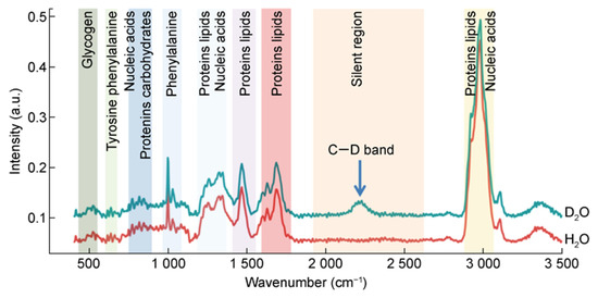 Label-free detection does not require the binding of bacteria with Raman tags, the SERS signal of the strain to be tested is obtained by directly binding the bacteria to the SERS substrate, and different Raman peaks appear for different bacteria due to the differences in the cell walls [78,79]. The Raman spectra of bacteria contain information about the different biomolecules in bacteria, as shown in Figure 5, which represent the vibrational modes of different molecules including DNA/RNA, proteins, lipids, and carbohydrates. Each pathogen has its specific chemical composition, so this information is referred to as a unique “Raman fingerprint” that identifies the pathogen [80]. Recent research primarily integrates label-free detection methods with algorithms designed to interpret SERS signals [81,82]. Furthermore, immunization techniques have been combined with SERS approaches, facilitating the label-free detection of bacteria. To date, various bacterial types have been identified by analyzing SERS signals [83].