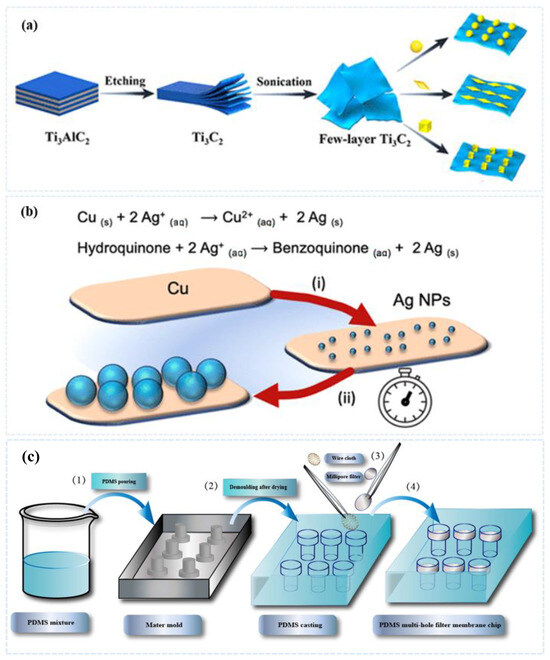 (a) Identification of bacterial pathogens at genus and species levels through a combination of Raman spectrometry: schematic of the fabrication process of Ti3C2-Au nanomaterial substrate. Reprinted (adapted) with permission from Jiang et al. [84]. Copyright (2023), American Chemical Society. (b) Cu/Ag nanoparticle-based SERS Substrates for label-free bacterial detection: schematic representation of Cu/Ag nanoparticle formation by (i) transient nucleation of Ag NPs and (ii) seed-mediated particle growth of Ag NPs nuclei in the presence of hydroquinone. Reprinted (adapted) with permission from Beyene et al. [85]. Copyright (2022), American Chemical Society. (c) Preparation of an Ag NPs@ Polydimethylsiloxane (PDMS) multi-hole filter membrane chip for the rapid identification of food-borne pathogens by SERS. Reprinted (adapted) with permission from Zhu et al. [86]. Copyright (2022), Elsevier.