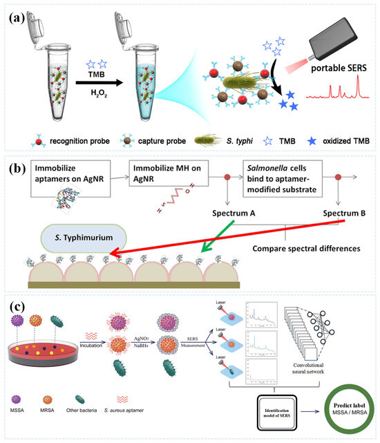 - Zhu, X.; Ning, Y.; Zhang, Z.; Wen, Y.; Zhao, Y.; Wang, H. A universal approach for sensitive and rapid detection of different pathogenic bacteria based on aptasensor-assisted SERS technique. Anal. Bioanal. Chem. 2023, 415, 1529–1543. [Google Scholar] [CrossRef] [PubMed]
