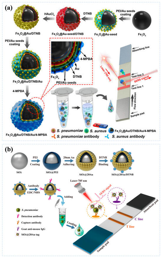 (a) Magnetic SERS strip based on 4-mercaptophenylboronic acid-modified Fe3O4@Au for active capture and simultaneous detection of respiratory bacteria. Reprinted (adapted) with permission from Li et al. [55]. Copyright (2023), MDPI, Basel, Switzerland. (b) Schematic of the preparation of SiO2@20Au nanocomposite, preparation of antibody-conjugated SiO2@20Au tag, and SiO2@20Au-based SERS-ICA for the quantitative of S. pneumoniae. Reprinted (adapted) with permission from Shen et al. [103]. Copyright (2023), MDPI, Basel, Switzerland.