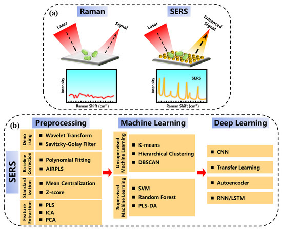 (a) Schematic diagram of conventional Raman and SERS for the detection of bacteria; (b) SERS detection preprocessing method and data analysis based on machine learning.
