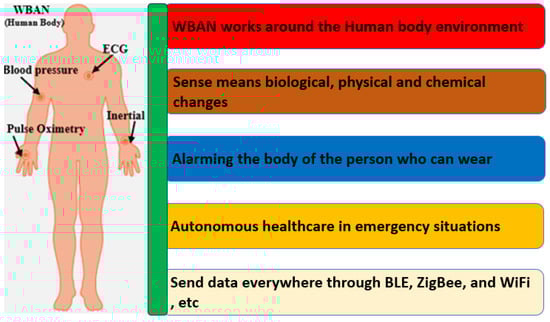 In [,], researchers evaluated power consumption and the quality of the data exchange in WBAN systems. RFID plays a significant role in numerous applications within short-range wireless networking. Although not as commonly used as RFID, Near Field Communication (NFC) is compatible with smartphones and tablets. In addition to Wi-Fi for short-range high-speed communication, cellular wireless systems like GSM (Global System for Mobile Communications), GPRS (General Packet Radio Service), and 3G, 4G, and 5G (third-, fourth-, and fifth generation) wireless technology for mobile telecommunication enable long-range wireless connectivity. GPRS-based systems are employed in various cellular wireless communication networks. Various researchers employed a design based on Wi-Fi and GPRS to monitor multiple wireless communication applications, achieving minimal data loss. For long-range networks, LPWANs (low-power wide-area networks) have been specifically designed to be compatible with the Internet of Things (IoT) devices. LPWANs offer low data rates and energy consumption, starting from 2G and extending to 5G networks [,,]. The principle of free hardware has recently been implemented in various wireless applications to control and analyse data. However, these technologies have not yet been fully utilised in healthcare, even though they are gaining traction due to their compatibility with Bluetooth, Wi-Fi, ethernet, LoRa (long-range), and Lora WANs (long-range wide-area networks). One example is ESP8266EX, which boasts a combination of affordability, energy efficiency, compactness, and dependable performance [].