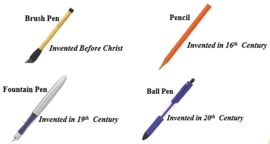 Writing electronics used in the literature: (a) brush pen, (b) fountain pen, (c) pencil, and (d) ball pen [].