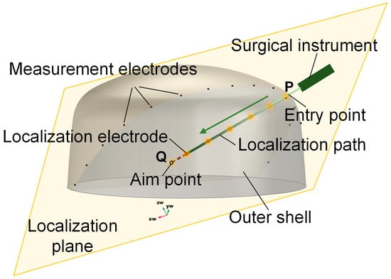 To validate the effectiveness of the proposed method, simulations were designed. The model dimensions were based on standard human head measurements and subsequently refined using smoothing techniques, with dimensions of 220 mm × 200 mm × 100 mm, as shown in Figure 3a. In the simulation, the COMSOL 6.1 Electric Currents module was employed; a constant-current source was implemented via a pair of point current sources with opposite polarities, and electrode 16 was designated as the ground. A refined mesh was applied within 1 mm of the localization plane, with a maximum element size of 0.0177 m and a minimum element size of 0.001 m, while a coarser mesh was used for the remaining regions, featuring a maximum element size of 0.0222 m and a minimum element size of 0.00399 m. Owing to the simple electric field involved in the EFSS method, the entire computation could be completed within 10 s on a standard PC. To replicate the linear motion of a surgical instrument along a predefined path during puncture procedures, the line segment PQ was designated as the planned surgical trajectory, with point P marking the surgical entry point, and point Q representing the surgical target, as illustrated in Figure 3b. The current injection point was positioned along the PQ line segment, the current exit point was assigned to one of the surface electrodes, and the grounding point was set at the reference electrode (R point). During the simulation and the experiment, electrode 16 was always set as the ground electrode (shown in Figure 4).