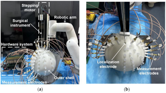 The outer shell was fabricated using resin via 3D printing, with its shape constructed based on cranial dimensions. The inner dimensions measured 220 mm × 200 mm × 100 mm, and a wall thickness of 8 mm was employed to secure the measurement electrodes. Fifteen measurement electrodes were fixed on the outer shell, and their positions could be adjusted according to the localization requirements. The electrode tips were made of copper, with their rear ends connected to the cyclic potential acquisition module via fine guide wires. This module includes potential measurement electrodes arranged on the surface of the human body and a multi-channel selection switch. This module collects the potential distribution generated on the body surface as a result of the electric field formed within the tissue. The acquired potential data are then transmitted to the EFSS localization host computer, which employs the EFSS method to precisely localize the localization electrode and compute its coordinates.