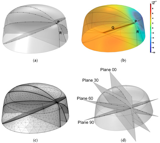 Furthermore, four 2D localization planes intersecting the PQ line segment at 30° intervals were defined and named Plane 00, Plane 30, Plane 60, and Plane 90. A top view of the electrode arrangement with respect to the four planes is shown in Figure 4. The planes from 120° to 180° were not considered because these planes were completely symmetrical to the previous planes, and the calculation results were the same. The measurement electrodes were placed as close as possible to these planes, forming the simulation model as shown in Figure 3d. Due to the model’s bilateral symmetry, electrode arrangements within the range of 0–180° are representative, and a 30° interval yielded stable optimization indices with minimal sensitivity to measurement errors. Moreover, smaller intervals resulted in practical issues, such as overlapping fixed holes on the outer shell, making the interval of 30° an optimal balance for simulation validation. The black dots in the illustration indicate the positions of the localization electrodes. This model was primarily developed to provide a computational framework for solving the forward problem.