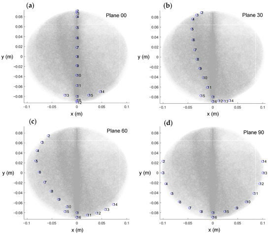 The top view of the electrode arrangement with respect to the four planes. (a) Plane 00. (b) Plane 30. (c) Plane 60. (d) Plane 90.