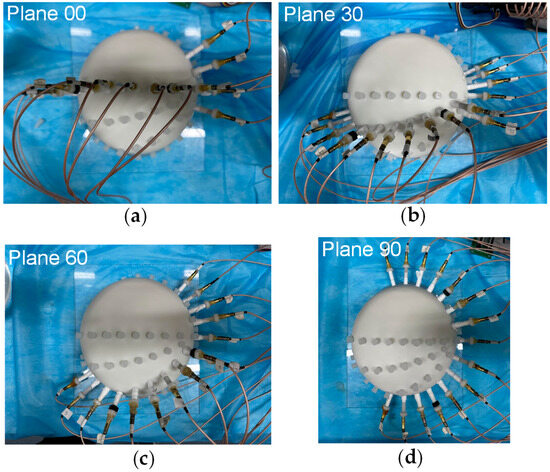 Actual picture of electrodes arrangement with respect to the 4 planes. (a) Plane 00. (b) Plane 30. (c) Plane 60. (d) Plane 90.