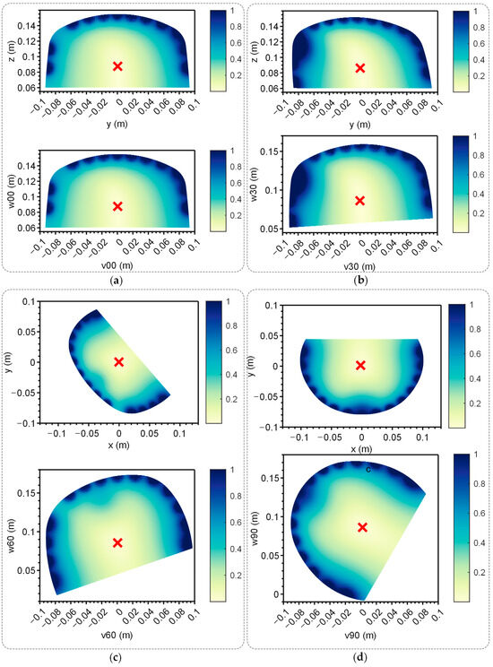 Error map of the 4 planes. Up: Error map of the yoz plane when the electrodes were distributed on the corresponding plane. Down: Error map of the yoz plane when the electrodes were distributed on corresponding plane after coordinate transformation. The red ‘x’ indicates the lowest point. (a) Plane 00. (b) Plane 30. (c) Plane 60. (d) Plane 90.
