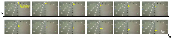The real position of the localization electrode during the experiment. The white circles indicate the locations where the measurement electrode holes were not arranged. The black circles indicate the measurement electrodes. The yellow arrows indicate the actual position of the localization electrode.