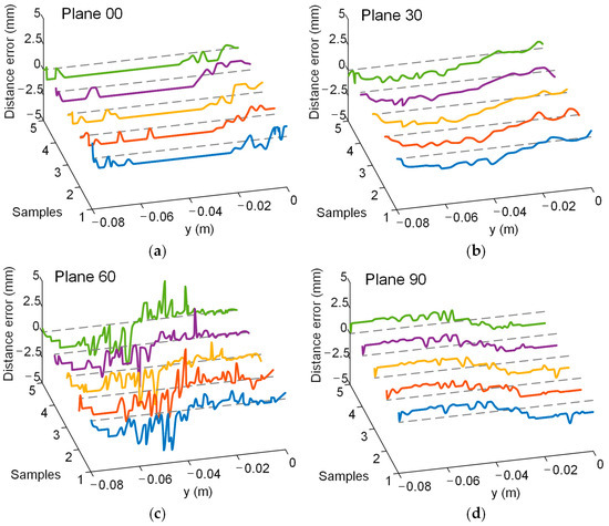 Distance error in the experiment. Different colored curves represent the results of multiple repeated experiments. The gray dashed line represents the position where the distance error is 0. Lines in five different colors indicate the results of five repeated experiments. (a) Plane 00. (b) Plane 30. (c) Plane 60. (d) Plane 90.