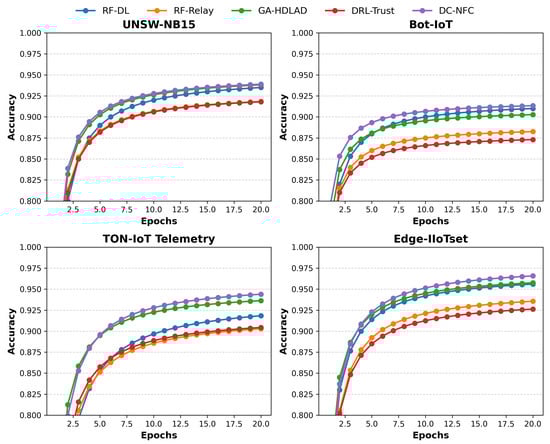 For the TON-IoT Telemetry dataset, DC-NFC achieved a remarkable accuracy of 96%, compared to RF-DL (91%), RF-Relay (89%), GA-HDLAD (94%), and DRL-Trust (90%). Lastly, on the Edge-IIoTset dataset, DC-NFC consistently delivered a peak accuracy of 95%, outpacing RF-DL (92%), RF-Relay (90%), GA-HDLAD (93%), and DRL-Trust (91%).