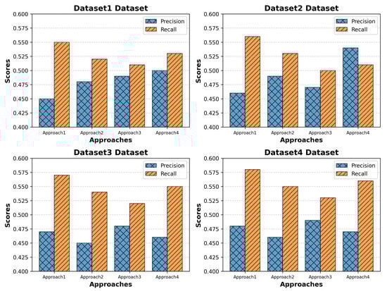 Figure 3, shows Precision and Recall across four datasets: In the case of the UNSW-NB15 dataset, precision is between 0.50 and 0.45 for different approaches, while recall is slightly higher, between 0.53 and 0.55, suggesting a close cluster in the evaluation metrics. Similarly, in the Bot-IoT dataset, precision is between 0.54 and 0.46 and recall between 0.51 and 0.56, suggesting a regular outperformance of recall over precision. The TON-IoT dataset shows a precision range between 0.48 and 0.47 and recall between 0.52 and 0.57, suggesting a more demanding aspect of high precision to be achieved. Finally, the Edge-IIoTset dataset, with precision between 0.48 and 0.47 and recall between 0.56 and 0.58, shows a regular performance of the DC-NFC in different IoT scenarios.