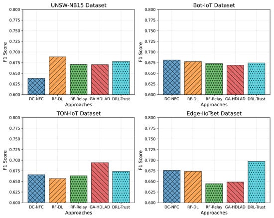 Figure 4, presents four datasets’ F1 scores: UNSW-NB15, Bot-IoT, TON-IoT, and Edge-IIoTset, using adjusted ranges of the y-axis between 0.6 and 0.8 to better indicate performance details. In the UNSW-NB15 dataset, the DC-NFC approach achieved a peak F1 score of approximately 0.75, demonstrating a significant improvement over traditional methods such as RF-DL (0.68), RF-Relay (0.65), GA-HDLAD (0.72), and DRL-Trust (0.67). The Bot-IoT dataset shows similar trends, where DC-NFC reached an F1 score of 0.74, surpassing RF-DL (0.69), RF-Relay (0.66), GA-HDLAD (0.70), and DRL-Trust (0.68). On the TON-IoT dataset, the DC-NFC framework recorded an F1 score of 0.76, reflecting superior detection capabilities compared to RF-DL (0.71), RF-Relay (0.68), GA-HDLAD (0.73), and DRL-Trust (0.69). Lastly, in the Edge-IIoTset dataset, DC-NFC demonstrated robust performance with an F1 score of 0.77, clearly outperforming RF-DL (0.72), RF-Relay (0.70), GA-HDLAD (0.74), and DRL-Trust (0.71).