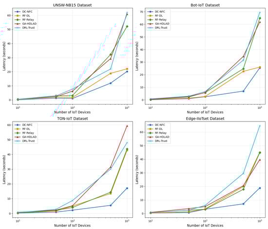 Figure 6 displays the latency metrics across four datasets: UNSW-NB15, Bot-IoT, TON-IoT, and Edge-IIoTset, with the x-axis set to logarithmic scale to accommodate the wide span of device counts from 10 to 1000. This scaling choice effectively elucidates the latency growth patterns as the number of devices increases, highlighting non-linear increases in latency that are more pronounced at higher device counts. For instance, in the UNSW-NB15 dataset, the DC-NFC approach demonstrated latencies that start at approximately 0.3 s for 10 devices and escalate to about 3.0 s for 1000 devices. Comparable increases in the dataset of Bot-IoT also take place in DC-NFC, having initial latencies of around 0.28 s for 10 devices to a maximum of 2.8 s for 1000 devices. The employment of a logarithmic scale brings such incremental increases in latency in a more apparent manner, more so when compared to more conventional approaches such as RF-DL, having initial latencies of 0.4 s for 10 devices to a maximum of 4.0 s for 1000 devices. The employment of a logarithmic scale in such a scenario allows for a better appreciation of scalability challenges associated with each method, hence a better and more efficient visualization of otherwise clustered-looking data in a linear scale.