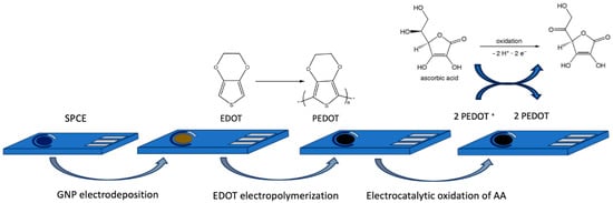 The surface of SPCEs was functionalized with GNP and PEDOT. For the first functionalization layer, GNPs were electrodeposited under potentiostatic conditions by drop casting 50 µL of 5 mM HAuCl4 in 100 mM KNO3 aqueous solution onto the surface of SPCEs and applying a potential of −1.6 V for 200 s, at room temperature, ranging from 20 to 26 °C. Following the electrodeposition of GNPs, the electrodes were subjected to a two-step activation process. This involved dipping the electrodes in a solution of 1.2 M NaOH for 5 min and then immersing them in 1.2 M HCl for the same duration.