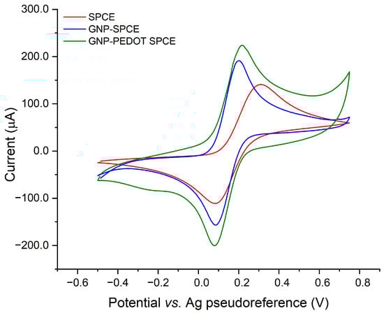 Figure 2. A comparison of the voltammograms acquired after each step of the functionalization of SPCEs surface demonstrates a progressive increase in the electron transfer-related currents of the redox probe. This behavior can be ascribed to the increased surface area and electrocatalytic properties of GNPs.