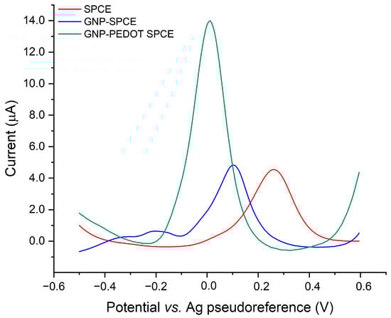 The remarkable electrocatalytic activity of PEDOT is demonstrated by a negatively shifted oxidation peak of AA (250 mg/L) and a significant enhancement in the anodic peak current compared to bare SPCEs and GNP-SPCEs, as reported in