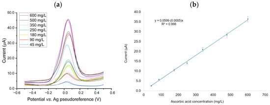 The analytical performance of the GNP/PEDOT-modified SPCE sensor was evaluated in standard ascorbic acid solutions in PBS, exploring a concentration range (45–600 mg/L) that matched the expected content of AA in fresh orange juice samples. Linearity across the entire explored range was demonstrated: the mean of the calculated regression residuals was found to be not significantly different from zero (p > 0.05).
