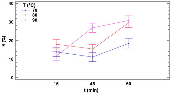 Figure 5 presents the signal reduction, R, along with confidence intervals calculated using Fisher’s Least Significant Difference (LSD) method, plotted against treatment time for the three selected temperatures. At the lowest temperature (70 °C), no significant differences among the three treatment times (15, 45, and 60 min) were observed due to overlapping confidence intervals. However, the overlap between the 60-min condition and the other two treatment times was minimal, suggesting a slight yet possibly meaningful increase in the reduction rate at 60 min. At 80 °C, no significant differences were detected between the two shorter treatment durations (15 and 45 min), but a substantial increase in the reduction rate was observed after 60 min, with a reduction increase of more than 50% compared to shorter treatment times. At 90 °C, a distinct behavior was observed compared to the other two temperatures. A significant increase in the reduction rate occurred between 15 and 45 min, marked by a steep slope, followed by a plateau between 45 and 60 min. This plateau may indicate the complete depletion of AA at the 45-min case, beyond which additional heating did not result in further reduction, even with prolonged treatment time.
