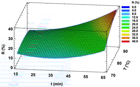 Based on these findings, the dataset was processed by MLR to develop a predictive model for the effect of heat treatment on ascorbic acid retention in orange juice samples. The response function calculated by MLR is presented in Equation (1), while the corresponding response surface is illustrated in