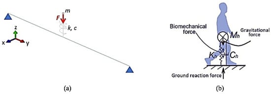 Biodynamic pedestrian modelling: (a) example of a simple structural model for HSI analysis and (b) schematic representation of Spring-Mass-Damper (SMD) pedestrian. Figure reproduced from [10] with permission from © Elsevier, under the terms and conditions of a Creative Commons CC-BY 4.0 license agreement.