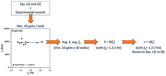 - the stiffness k of the pedestrian is first calculated from the experimental records of each gait, according to Equations (1) and (2), with m = M: