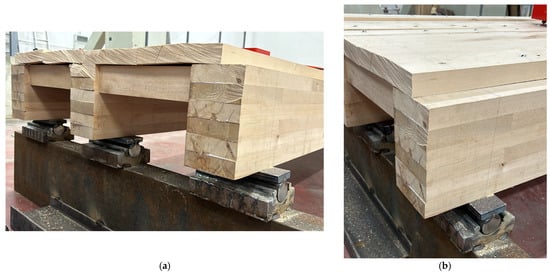 According to Figure 3, the specimen was assembled to have a nominal span L = 4000 mm and a distance between supports of 3700 mm. The resisting cross-section of the floor consisted of three glulam longitudinal beams (130 × 240 mm, their section), spaced 530 mm apart (Figure 3a). The basic mechanical properties of the glulam material were obtained through previous four-point bending tests, as discussed in [33], and carried out according to EN 408 standard [34]. The tests resulted in mean and characteristic values of fm,k = 40 MPa, E0,mean = 14,360 MPa, and ρm = 695 kg/m3.