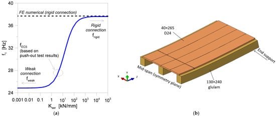 Another critical parameter is represented by the fundamental vibration frequency of the floor and possible resonance issues with pedestrians. Based on preliminary analytical estimates that were carried out according to the Eurocode 5 for the empty floor, its beam-like fundamental vibration frequency in a simply supported condition was predicted at about fEC5 ≈ 28.5 Hz, which means a still rigid (but relatively light) pedestrian structure compared to normal walking features. It is important to remember, however, that the serviceability stiffness of the connections in use is a major influencing parameter on the structural side [1]. In this sense, a typical trend of analytical fundamental vibration frequencies for the empty floor prototype is shown in Figure 5a as a function of the connection stiffness. Whilst the global performance of the floor can still be associated with a beam-like response (Figure 5b), the connection in use was expected to provide a rather weak bond compared to a fully rigid connection. The calculated fEC5 value resulted in a relatively small rigid configuration (frigid = 37.6 Hz) and was rather close to a weak connection (fweak = 24.8 Hz).