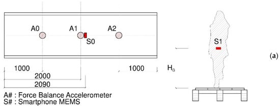The experimental program was carried out according to the test setup schematised in Figure 6a. To perform the dynamic tests, the floor was instrumented with three force balance accelerometers, 1.5 kg in weight each, placed in the A0 and A2 positions (¼L and ¾L) and in A1 (the mid-span section). The sample rate of these accelerometers was set at 200 Hz. Furthermore, a smartphone (S0 sensor) was fixed to the floor for the whole experimental campaign, close to the central accelerometer A1, in order to collect the vertical acceleration data with a sample frequency of 250 Hz. The S0 sensor consisted of a Xiaomi Redmi Note 7 device with 4 GB RAM and an octa-core processor (2.20 GHz maximum). Finally, for the SMD model calibration, a dedicated smartphone was fixed to the body CoM of each pedestrian (the S1 sensor in Figure 6a) and secured by the belt in the HG position.