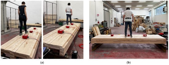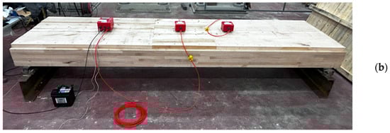 To perform the non-destructive dynamic tests, a full-scale timber floor was built at the Laboratory of Materials and Structures of the University of L’Aquila, Department of Civil, Construction-Architectural, and Environmental Engineering.