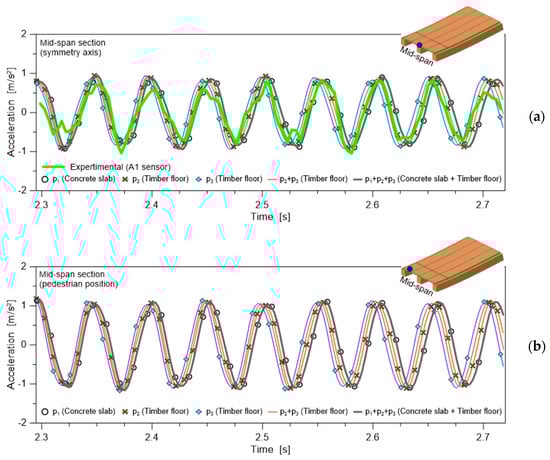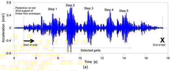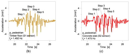 Generally, the experimental results were found to agree with Figure 8 in terms of acceleration at the mid-span section of the timber floor (Figure 8a) or the body CoM acceleration for pedestrian p2 when walking, respectively, on the timber floor (Figure 8b) or on the rigid concrete slab (Figure 8c).