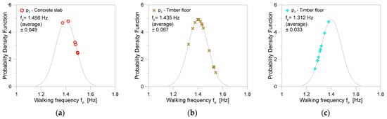 Gaussian distribution of average walking frequencies fp for the post-processed experimental walks of (a,b) p2 and (c) p3 pedestrians.