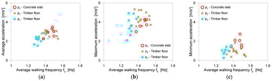 Measured vertical body acceleration for each experimental walk as a function of the walking frequency fp in terms of (a) average, (b) maximum, and (c) minimum values.