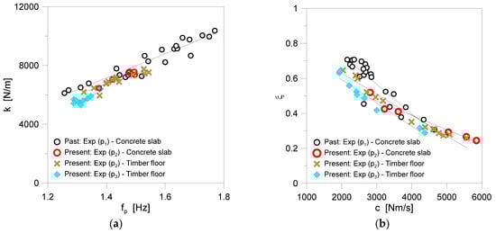 Finally, for the p3 volunteer walking on the timber floor, the measured stiffness k, as shown in Figure 11a, showed a further decrease compared to previous results for a given frequency. Notably, p3 walked slower than p2, and some variability in the SMD-calibrated parameters could also be attributed to individual motion features.