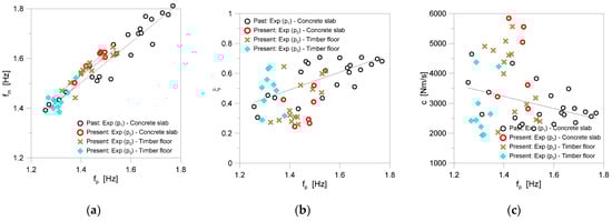 The typical results can be found in Figure 11, where each dot at a given frequency fp represents the output of the average calibration for a single walk. Overall, it can be seen from Figure 11 that the present results are closely aligned with earlier findings. Considering the major uncertainties of the present experimental study (i.e., different pedestrians and substructures, smartphone-based registrations, limited number of gaits, etc.), this kind of outcome can confirm the validity and robustness of the original SMD proposal, as outlined in Section 2.