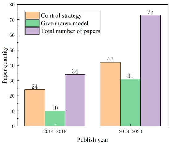 Figure 1 shows the temporal distribution of academic journal articles and conference papers published from 2014 to 2023 according to the control strategy and the greenhouse model. Between 2014 and 2018, there was a comparatively lower volume of publications. However, in the subsequent period from 2019 to 2023, a noteworthy surge in research output emerged, particularly concerning control strategies and greenhouse models. This indicates an escalating involvement of scholars in the research of greenhouse control strategies and models.