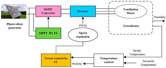 To adjust the temperature and humidity in the greenhouse, Riahi [54] designed a multi-input and multi-output fuzzy controller, in which the ventilation, heating, and humidification functions in the greenhouse are controlled by the motor. The greenhouse climate is adjusted to the optimal state through a fuzzy control algorithm to control the actuator. In addition, the model of photovoltaic power generation is established, and the speed control of the asynchronous motor is carried out by vector control optimized by fuzzy logic to achieve an energy-saving purpose. The photovoltaic (PV)-based ventilation system is shown in Figure 3.