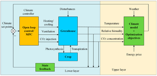 Achour et al. [65] used MPC to propose a novel control strategy for the optimal operation of a microgrid powered greenhouse, which can maintain the optimal greenhouse microclimate, and can manage irrigation, lighting, ventilation, and dehumidification, and accomplish the goal of energy conservation. Bersani et al. [66] adopted the MPC method to keep the greenhouse’s temperature at its ideal level while consuming the least amount of energy. Jung [5] proposed an MPC-based greenhouse temperature optimization ventilation system with excellent control performance, which drives the operation of several interior windows of the greenhouse by forecasting internal temperature changes. Lin et al. [67] proposed a hierarchical control strategy for the Venlo greenhouse system. The upper layer sets different optimization learning objectives (different strategies), and the lower layer uses MPC to track the trajectory obtained from the upper layer, and the control performance of the MPC controller and the open-loop controller is compared. The results showed that the MPC had a better prediction accuracy. The greenhouse climate hierarchical control architecture is shown in Figure 5.