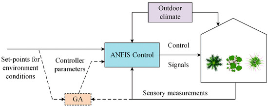 Castaneda-Miranda [82] introduced a defrosting control system, which was realized by integrating the Internet of Things (IoT) and hybrid AI methods in the greenhouse environment. The system employs an artificial neural network for greenhouse temperature prediction, achieving a remarkable accuracy of up to 95%. Afterwards, fuzzy control is employed to regulate the temperature based on the presence of frost in the greenhouse, and the purpose of defrost is effectively realized. Ding [83] proposed a monitoring system based on a Programmable Logic Controller (PLC) and Supervisory Control and Data Acquisition (SCADA); the system, combined with an artificial neural network, was able to predict the environmental parameters for Dendrobium officinale growth and achieve real-time monitoring and intelligent control. Mohamed [84] proposed an Adaptive Neuro-Fuzzy Inference System (ANFIS), combined with genetic algorithm (GA) to adjust the controller. According to the set value and the changing outdoor climate conditions, the temperature and humidity of the greenhouse system were adjusted to adapt to the changing climate conditions in the greenhouse. The control structure is shown in Figure 7. To solve the issue of switching between two different heating systems in the greenhouse to control the nighttime temperature, Montoya [85] designed a hybrid model-based predictive controller. The system dynamics were represented by a hybrid model. The model predictive hybrid controller was used to adjust the inner temperature at night, and the optimal control signal was calculated based on the power consumption and commutation minimization. Although hybrid control incorporates the advantages of various control algorithms and has higher accuracy and anti-interference capabilities, the complexity of hybrid control is also higher than other control algorithms and is difficult to implement. Therefore, it is essential to take into account the advantages and disadvantages of existing control algorithms in the research of hybrid control and choose the optimal control algorithm as the basis of hybrid control according to the characteristics of the actual problem.