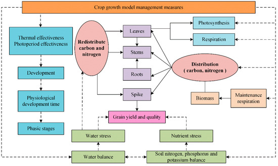 Crop growth models are mainly based on the developmental patterns and productivity formation of crops to establish mechanistic models of crop growth. These models simulate the growth and development of various plant organs (leaves, stems, roots, etc.), photosynthesis, and nutrient transport. By promoting improved regulation of crop growth, they can predict the processes of crop growth, development, yield, and quality formation. The fundamental model of crop growth is illustrated in Figure 8.
