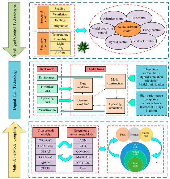 With the increasing concerns surrounding food security [25], greenhouse modeling has increasingly become a focal point. Greenhouse models mainly comprise the greenhouse microclimate model and crop growth model. The greenhouse microclimate models are mainly categorized as mechanical models and black-box models [26]. Based on the diverse methods of model establishment, their modeling tools are divided into artificial neural networks (ANNs) [27], computational fluid dynamics (CFD) [28], and other simulation software [29]. Crop growth models [30] quantitatively describe the dynamic processes of crop growth, development, seed formation, and yield under meteorological conditions, soil conditions, and crop management practices. Common crop growth models include the Decision Support System for Agrotechnology Transfer (DSSAT) model [31], Gossypium Simulation (GOSSYM) model [32], Crop Environment Resource Synthesis (CERES) model [33], Crop Growth (CROPGRO) model [34], Agricultural Production Systems Simulator (APSIM) model [35], and World Food Studies (WOFOST) model [36]. Both greenhouse microclimate and crop growth models have limited predictive accuracy in complex environments. The challenge of coupling these models and improving their precision in practical applications remains unresolved.