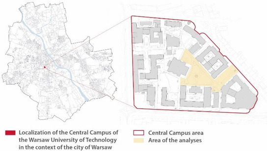The Central Campus of the Warsaw University of Technology is a fenced area located in the central part of Warsaw with an area of 8.88 hectares (Figure 1). The area is a semi-public space which is open to all users but is specifically dedicated to the academic community and the inhabitants of the residential buildings located in the area (Figure 2). There are a total of 17 buildings in the area in question, 15 of which house a total of 10 faculties of the Warsaw University of Technology. The university’s buildings include those built in the initial period of existence of the campus from 1899 to 1939, which were partially rebuilt in the post-war period, as well as later additions built in a style representative of the period of their construction. The buildings most recently were completed between 2010 and 2013. According to the typology presented earlier in this paper, the analyzed area is a building-dominated area (place-making—building-dominated) [18] and can be defined as an existing campus supplemented according to Żabicki’s typology [19]. The site features tall vegetation, including old trees.