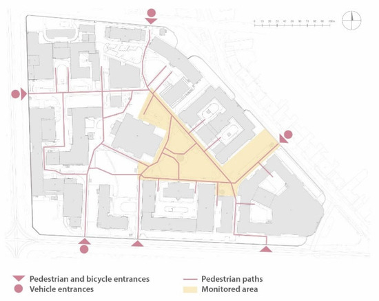 Sensors that use the IoT technology and networks composed of them—Wireless Sensor Networks (WSNs)—are widely used to collect and analyze data in areas such as agriculture monitoring [26], environment monitoring [27], health monitoring of the elderly [28], industry, especially according to the Industry 4.0 concept [29], smart home systems [30], smart cities [31], and many others. IoT devices are usually small electronic devices that have interfaces for access to the Internet (Wi-Fi, Ethernet, LoRa) or for direct communication (Bluetooth Low Energy, NFC) and allow flexible use for measuring various parameters. The literature identifies works on the use of CCTV in urban spaces [32], public places [33], metropolises [34], suburbs [35], urban parks [36], or public transit systems [37]. Only a few papers deal with the use of CCTV on university campuses. Design research conducted at the University of Technology Sydney showed how CCTV cameras can help interact and manage public spaces [38]. The author presents the potential of CCTV cameras as a design tool. The article discusses how the use of the interactive potential of the CCTV system can influence a new understanding of urban space, which will replace the symbolic role for form with the effect of form.