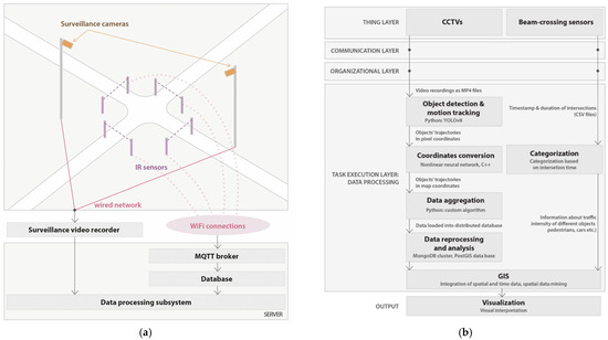 Acquisition process of spatial–temporal knowledge seen from two perspectives: (a) our IoT sensor network’s architecture and (b) a data processing scheme.