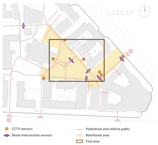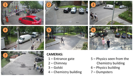 The measurements carried out between 16 May and 28 November 2022 used six beam-crossing sensors placed on campus, as shown in Figure 4. A rectangular test area of approximately 1.1 hectares (122 by 92 m), colored brown, was selected for the study. The input data are in the form of an array of beam intersection events with timestamps, along with their duration, measured with millisecond resolution. Video data from surveillance CCTV cameras (see Figure 4 for locations, see Figure 5 for exemplary views) were obtained from university campus administration for the following periods: from 7 July to 15 July, 23 October to 30 October, 21 November to 28 November 2022, later considered “sessions”. The analysis sessions were limited to selected weeks due to the large effort required to process the data. To give a point of reference, the total size of all video files acquired from CCTV cameras from the last session (as an example) was about 900 GB, which corresponds to a total of about 1170 h of video footage (7 cameras, 7 full days). The average bitrate per video stream was 1.7 Mbps, with significant variation depending on the amount of recorded traffic. The recordings have been processed according to the procedure described in the next section. It should be noted that operating on video files (rather than real-time data processing) was chosen for this study for practical reasons: this allowed the processing algorithms to be repeatedly improved and analyzed in a controlled environment without losing the overall concept.
